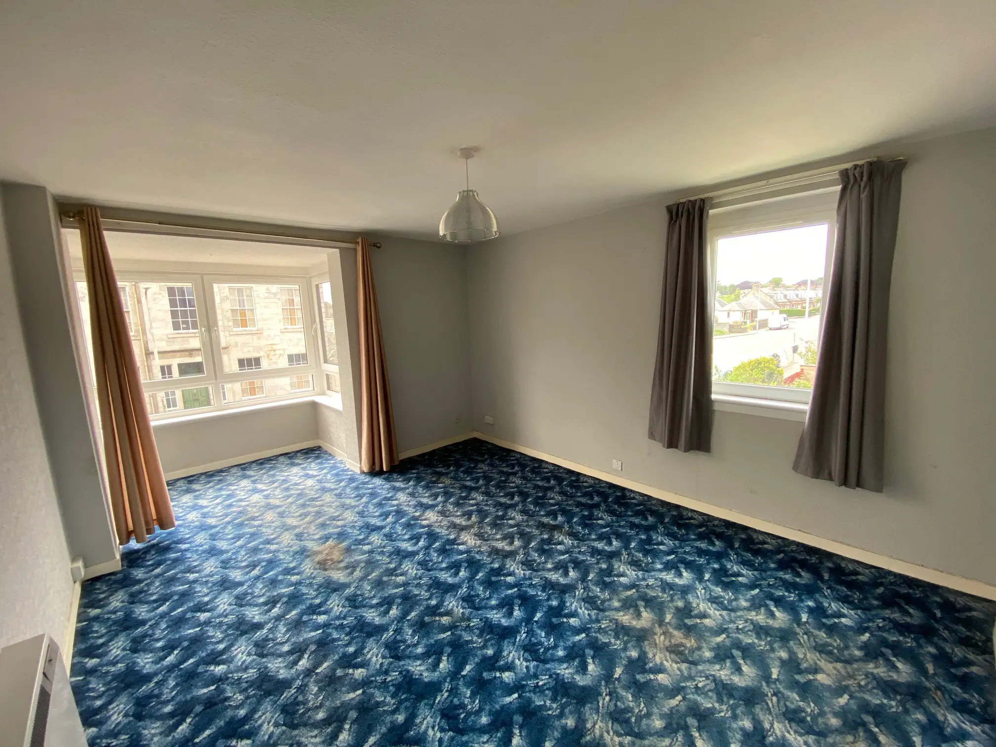 spacious lounge with a box bay style window, a kitchen, a double bedroom